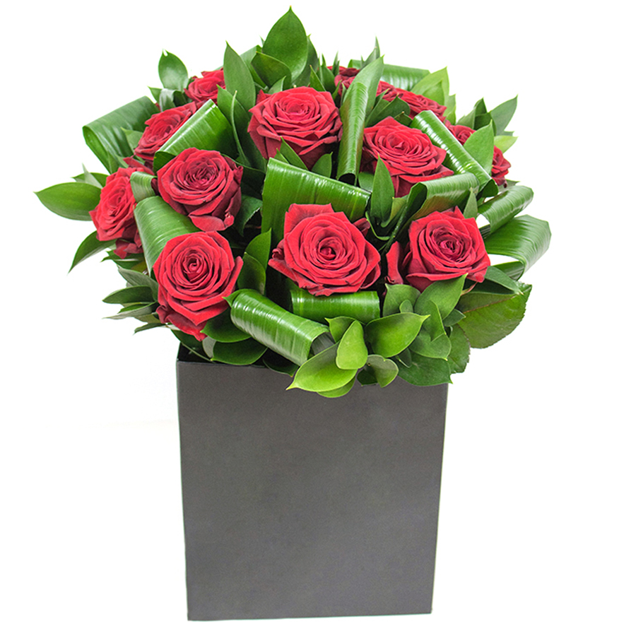 Immerse yourself in the stunning beauty of our exquisite red rose bouquet. This unique arrangement features vibrant red roses intertwined with graceful aspidistra leaves and lush ruscus, creating a harmonious blend of colors and textures.